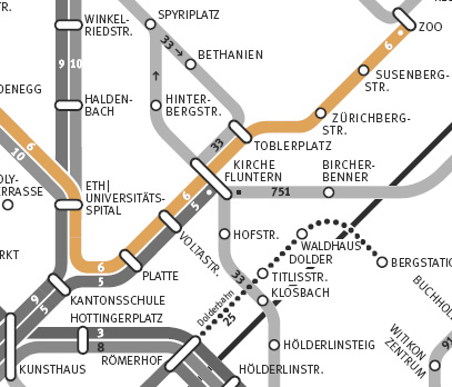 Zoo - Kirche Fluntern - ETH/Universitätsspital - Central - Hauptbahnhof - Paradeplatz - Bhf. Enge